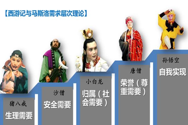 这就好比西游记的唐僧五师徒,猪八戒是典型的生理需求,简单、直接且快乐,道德感和理想化不足;沙僧是典型的安全需求,追求稳定和秩序化,没有什么太大的人生追求和理想;小白龙是社会归属需求,之前是因为犯错了被流放,需要重新得到主流群体的认可;唐僧则是为了荣誉,是为了被尊重和需要,而不畏艰辛、求取真经;孙悟空则是为了重获自由和放飞自我,是自我实现的需求,其对生理、安全、社会和被尊重的需求不成问题。